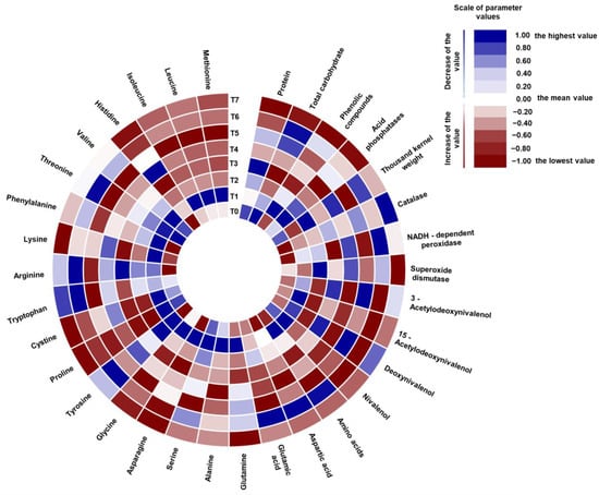 Relative values of wheat metabolites, antioxidant enzymes’ activities, TKW, mycotoxins, and individual amino acids in seven diversified treatments. T0—control; T1—F. culmorum, T2—herbicide + fungicide 1 + fungicide 2; T3—herbicide + fungicide 1 + fungicide 2 + F. culmorum, T4—herbicide + fungicide 1 + fungicide 2 + humic acids; T5—herbicide + fungicide 1 + fungicide 2 + humic acids + F. culmorum; T6—herbicide + fungicide 1 + fungicide 2 + nitrophenols; and T7—herbicide + fungicide 1 + fungicide 2 + nitrophenols + F. culmorum.