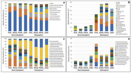 Bacterial community composition in the root endosphere and rhizosphere samples for different wheat cultivars. Bars represent average relative abundance values from each cultivar sequenced (in triplicate) for more (A,C) and less abundant (B,D) representative taxa at the phylum and family level, respectively. Relative abundance values can be found in Tables S2–S5. Raw values can be found in Table S12. * p ≤ 0.05.