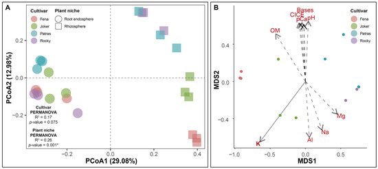 PCoA plots using Bray–Curtis similarity metrics indicate a greater dissimilarity between the root endosphere and rhizosphere samples (PCoA 1) compared to that among wheat cultivars bacterial community distance matrixes (PCoA) (A), and the influence of soil physicochemical data upon the rhizosphere (MDS) (B). Data points represent the mean values for the rhizosphere or endosphere niches of individual samples belonging to a wheat cultivar. * = p-value under 0.05.