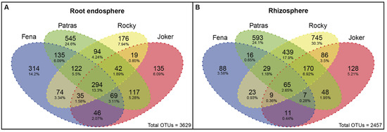 On the other hand, higher numbers of unique OTUs were observed in the root endosphere from Patras (545; 24.6%) and Fena (314; 14.2%) cultivars, whereas fewer unique OTUs were observed in Rocky and Joker cultivars (176; 7.9% and 135; 6.0%, respectively) (Figure 3A). Moreover, rhizosphere samples showed the greater amount of unique OTUs from Rocky (745; 30.3%) and Patras (593; 24.1%) in comparison with Jocker (128; 5.2%) and Fena (88; 3.5%) cultivars (Figure 3B).