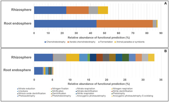 Predicted bacterial functional traits for the taxa in the root endosphere and rhizosphere were more numerous for the root endosphere than rhizosphere (Figure 4, Table S8). For all cultivars, chemoheterotrophy (44.2 to 22.8%) and aerobic chemoheterotrophy (39.7 to 15.9%) were the most abundant metabolic groups, independent of the plant niche or cultivar. A larger proportion of metabolic function assignments was related with fermentation and animal parasites or symbionts in the rhizosphere samples compared to those from the root endosphere samples, with values ranging from 6.6 to 7.1% and from 2.8 to 0.6%, respectively. Among the lesser abundant predicted traits, a majority were assigned to nitrogen cycling processes such as nitrate reduction, nitrogen fixation, nitrate respiration, nitrogen respiration, ureolysis, and nitrification (Figure 4, Table S8). Contrastingly, although similar functions were predicted, only ~5% of the root endosphere functionality was explained.