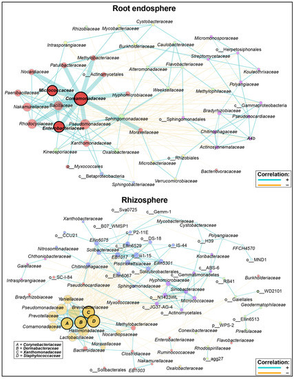 For example, the root endosphere network was composed of fifty (50) families identified among five (5) main clusters, with all the nodes and clusters directly or indirectly connected through positive correlations. The root endosphere network was described as 0.48, 0.18, 50.5, and 0.04 for the clustering coefficient, modularity, positive edges (%), and natural connectivity, respectively (Table S11). Nodes within clusters were highly connected; however, connections to other clusters were limited. Among those, the largest connected cluster (LCC) was formed by strong correlations among 13 families (Comamonadaceae, Micrococcaceae, Enterobacteraceae, Pseudomonadaceae, Moraxellaceae, Hyphomicrobiaceae, Methylobacteraceae, Patulibacteraceae, Nocardiaceae, Paenibacillaceae, Nakamurellaceae, Rhodocyclaceae, and Bacillaceae), with the Comamonadaceae family as the central node.