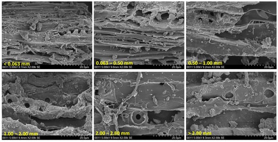 The physiochemical properties of biochar fractions varied with particle size (Table 1). Biochar pH ranged from 9.0 to 9.5 and did not vary significantly with particle size (ANOVA p > 0.05). EC values did vary significantly (ANOVA p < 0.001): the smaller size fractions had a higher EC than the soil, while the larger fractions had a lower EC than the soil (>1 mS/cm). Both bulk density and tap density varied among particle size classes (ANOVA p < 0.001) and were negatively correlated with particle size (r = −0.881 and r = −0.860; p < 0.001: analysis based on mid-points of size ranges). The compression (Hausner) ratio also varied with particle size (ANOVA p = 0.018), being largest for the 0.063–0.50 mm size category and smallest for the 1–2 mm size category (Table 1). SEM images indicated a collapse of wood cell structure in biochar particles at the smallest size fractions (Figure 1), suggesting reduced macroporosity.