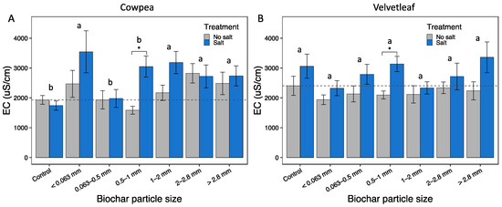 Biochar particle size and salt addition effects on soil EC in cowpea (A) and velvetleaf (B). Means are plotted ±1 SE. The dashed line in each panel indicates the control with no salt. ANOVA results indicate significant salt effects in both cases and a significant biochar particle size effect in the case of cowpea (Table 2). Letters indicate differences among biochar particle size treatments (p < 0.05) according to the Scott–Knott post hoc test clustering algorithm. Asterisks indicate the significance of salt treatments within a biochar particle size class: *, p < 0.05.