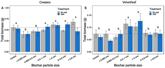 Biochar particle size and salt addition effects on biomass production at harvest (at 67 days) in cowpea (A) and velvetleaf (B). Means are plotted ±1 SE. ANOVA results indicate significant biochar particle size effects in both cases (Table 2). The dashed line in each panel indicates the control with no salt. Letters indicate differences among biochar particle size treatments (p < 0.05) according to the Scott–Knott post hoc test clustering algorithm.