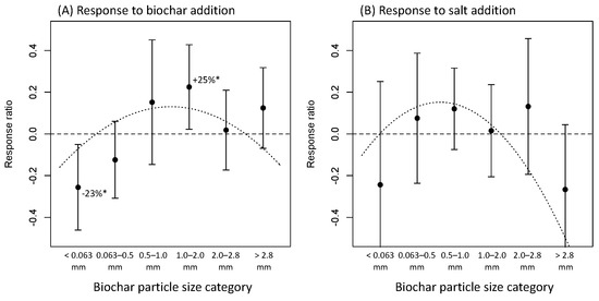 The pooled response ratio for the biomass response to salt addition did not deviate from zero for any biochar size category (Figure 4B), and the test for effects of moderators was not significant (p = 0.135). However, both the first- and second-order meta-regression terms were significant in this case (p = 0.038 and p = 0.041, respectively), with the peak falling between the 0.063–0.5 mm and 0.5–1.0 mm size categories (Figure 4B).