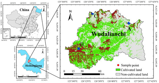 The geographical location of the study area and the distribution of soil sample points. A, B, and C were typical sample points which indicated the inappropriate fertilizer application schedules of the study area.