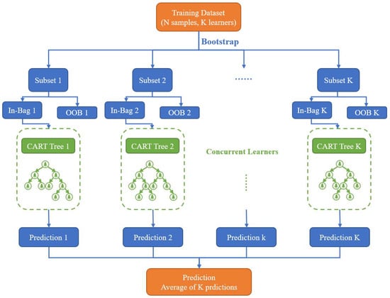 Random forest (RF), first proposed by Breiman [43], is a widely used machine learning model that introduces the idea of randomness into bagging (bootstrap aggregating). Specifically, RF uses the decision tree constructed based on the CART algorithm [44] as the base learner. Each base learner can randomly select samples from the original dataset with a replacement, create subsets, and then make classification (regression) rules according to the characteristics of the samples. Several essential learners jointly form the random forest and determine the prediction result by voting (average). Compared with the bagging method, the randomness of RF is reflected in two aspects. First, the process of selecting sub-datasets using RF is random, the samples in different sub-datasets can be repeated, and the samples in the same sub-dataset can also be repeated and second, in the splitting process of the decision tree node, RF will randomly select several features from all the features and then select the optimal feature from them, which can ensure the diversity of the entire system (Figure 2). More details about RF can be seen in the work of Breiman [43].