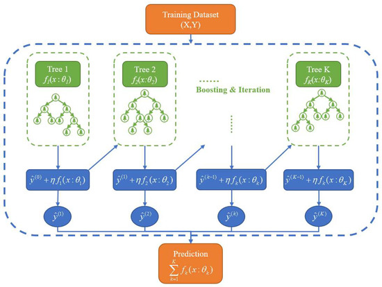 Extreme gradient boosting (XGBoost) is an efficient and flexible new machine learning model based on the gradient boosting decision tree (GBDT) method. It was proposed by Chen and Guestrin [47]. It uses the Taylor expansion to obtain the second derivative as an independent variable and automatically utilizes the CPU’s multi-threaded parallel computing to improve computational efficiency. It builds an end-to-end boosting system based on the tree model (Figure 3) [48].