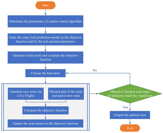 Flowchart illustrating the process of the optimization of fertilization-related parameters based on the cuckoo search algorithm (CSA).