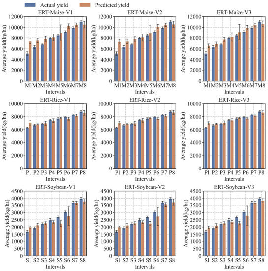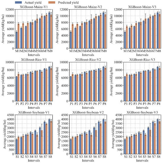 The actual yields of maize, rice, and soybean were divided into eight intervals and noted as M1–M8, R1–R8, and S1–S8, respectively, which could better reflect the crop yield distribution and reduce the influence of random error caused by the field survey (Figure 6). It can be seen that the predicted yield of different crops in each interval is close to the actual value. However, there are still specific differences among the three crops using different IVCs (Table 6). RF obtained the highest accuracy for rice yield prediction when the IVC was V3.