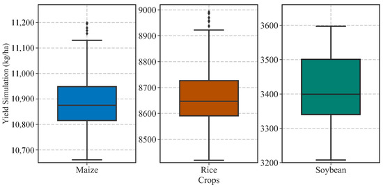 Distribution of the predicted yields (yield simulations on the y-axis) of maize, rice, and soybean calculated by the FDM.