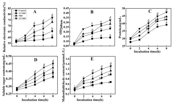 To measure cell membrane permeability, relative conductivity was measured according to Liu’s method [20], intracellular nucleic acid leakage was determined using Tao’s method [21], intracellular protein release and soluble sugar release were determined using Chen’s method [22], and Malondialdehyde (MDA) content was determined using Wei’s method [23].