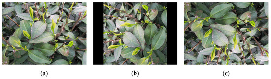 LabelImg was used to annotate one bud and one leaf (as “TS”) of the tea canopy shoots, and tea shoots that were more than 75% occluded or blurred were not annotated (Figure 3), and the annotation information obtained was saved in XML format [24]. The training set, validation set, and testing set were randomly divided in a ratio of 6:2:2. For enhancing the richness of the experimental dataset and improving the generalization ability of the model, the dataset was expanded via rotating, mirroring, adding noise, and randomly changing the brightness and contrast (Figure 4). Data augmentation was performed for each training image in the dataset using random combinations of the above five methods. Meanwhile, the corresponding annotation file of each image was transformed. The final number of images in the training set, validation set, and testing set are 4347, 484, and 484, respectively. The division of the image dataset under different light conditions was shown in Table 1.