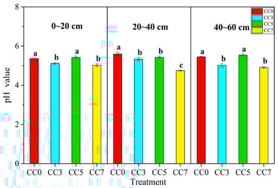 The values of gravity water under CC0, CC3, and CC5 had decreased by 0.1211, 0.1321, and 0.1279 cm3 cm−3 (0~20 cm), respectively; by 0.0901, 0.0702, and 0.0789 cm3 cm−3 (20~40 cm), respectively; and by 0.0981, 0.1474, and 0.0908 cm3 cm−3 (40~60 cm), respectively, (Table 3) relative to those under CC7. However, no significant relationship was found between gravity water and soil depths. Similarly, the available water and unavailable water were changed with the continuous cropping years, while there was no significant difference between (un)available water. The available water at 0~20 cm and 20~40 cm was higher in CC0 than in CC3, CC5, and CC7. Meanwhile, the available water at 40~60 cm followed the order of CC3 > CC0 > CC5 > CC7 (Table 3). In addition, the available water in CC0 was higher than that of CC7, which was higher than 0.0194 (0~20 cm), 0.0327 (20~40 cm), and 0.0316 (40~60 cm) cm3 cm−3 (Table 3). Furthermore, the unavailable water at 40~60 cm in CC3 (0.3569 cm3 cm−3) was the highest, followed by that at 40~60 cm and 20~40 cm in CC0.