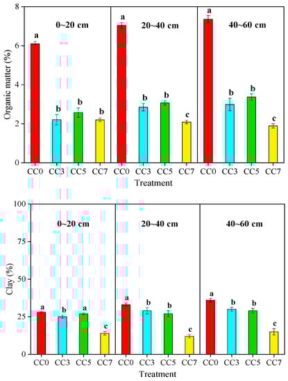 The effects of different continuous tobacco cropping durations or tomato rotation systems on soil physicochemical properties are illustrated in Figure 2. Compared with those at each soil depth in CC0, the pH levels at each soil depth in CC7 had decreased by 6.34% (0~20 cm), 15.03% (20~40 cm), and 9.91% (40~60 cm). Throughout the different durations of continuous cropping, there was a general decrease in soil organic matter content (Figure 2). Moreover, the organic matter content at the same soil depths in CC3, CC5, and CC7 was consistently lower than that in the cropping rotation system (CC0). The organic matter content in CC7 was the lowest and was 3.9% (0~20 cm), 4.95% (20~40 cm), and 5.47% (40~60 cm) lower than that in CC0. Soil organic matter content generally increased as the soil depth increased. The organic matter content at 40~60 cm was 1.26% (CC0), 0.78% (CC3), and 0.8% (CC5) greater than that at 0~20 cm. Meanwhile, in CC7, the soil organic matter content at 40~60 cm was lower than that at 0~20 cm, which was 0.31% (Figure 2). Furthermore, clay content had an opposite trend with the extension of continuous cropping years. Specifically, the clay contents of CC7 in each soil layer had decreased by 14% (0~20 cm), 21% (20~40 cm), and 21% (40~60 cm), respectively, relative to those in CC0. Vertically, clay content increased with the increase in soil depths. The clay contents at 40~60 cm increased by 8% (CC0), 5% (CC3), 2% (CC5), and 1% (CC7) compared with those at 0~20 cm (Figure 2).