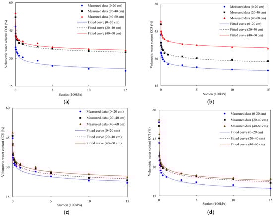 Soil samples were analyzed at the laboratory of Hohai University. Soil clay content was determined by using the hydrometer method [18]. Soil pH was measured by preparing a 1:2.5 soil:water slurry and using a pH electrode. Soil organic matter content was obtained using the potassium dichromate–sulfate acid colorimetric method [19]. SWCCs were acquired by using a pressure plate apparatus (Pressure Vessel 1500, Soil Moisture Equipment Corp., Goleta, CA, USA) in accordance with the method of Yang et al. [7]. Measurements of θ were made at operating pressures of 0, 0.05, 0.1, 0.2, 0.3, 0.5, 1, 3, 5, 10, and 15 (100 kPa) (Figure 1). Ultimately, each soil sample was maintained at 105 °C until it reached a constant mass, then weighed three separate times. To derive the soil’s volumetric water content at each pressure level (saturation to wilting), the mean was calculated.