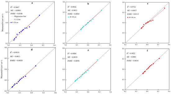 The coefficient of determination (R2), mean error (ME, cm3 cm−3), and root mean square error (RMSE, cm3 cm−3) were employed to assess the models’ performance in predicting the SWCC, the formula is [23].