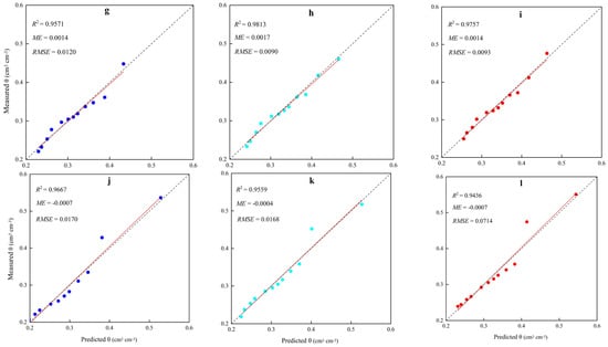 Comparison of the measured and predicted soil water contents under different treatments. Letters (a–c) represent 0~20, 20~40, and 40~60 cm in CC0, respectively; similarly, (d–f) represent each layer in CC3; (g–i) represent each layer in CC5; and (j–l) represent each layer in CC7.