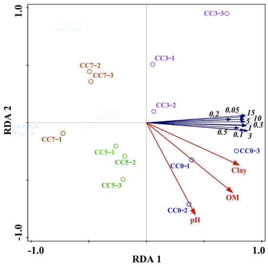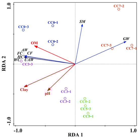 RDA demonstrates the relationships between soil water holding capacity and soil physicochemical properties. Clay represents clay content; OM represents organic matter; The numbers 0.05, 0.1, 0.2, 0.3, 0.5, 1, 3, 5, 10, and 15 represent the soil water holding capacity at each soil suctions (100 kPa); CC0−1, CC0−2, and CC0−3 represent the soil depths of 0~20, 20~40, and 40~60 cm in CC0, respectively; the soil depths in CC3, CC5, and CC7 are denoted similarly to those in CC0.