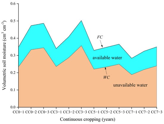 The deterioration of soil physicochemical conditions negatively affected soil hydraulic characteristics. The available water changed with the duration of continuous cropping, and the soil available water in CC0 and CC3 was higher than that in CC5 and CC7. These results agree with Awe et al. [38], who demonstrated that tillage practices either increased or decreased soil water retention at field capacity and that the changes in soil texture markedly influenced soil available water. Similarly, the results also agree with Aiken et al. [39], who showed that continuous cropping may reduce soil water availability. However, our findings contradict Blanco-Canqui et al. [10], who indicated that long-term tillage systems did not differently affect saturated hydraulic conductivity, water retention, and available water. This difference was due to the major influences of different types and intensities of tillage practices on soil properties and processes and thereby modified soil water availability.