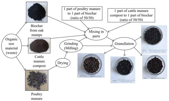 Gaudutis, A.; Jotautienė, E.; Mieldažys, R.; Bivainis, V.; Jasinskas, A. Sustainable Use of Biochar, Poultry and Cattle Manure for the Production of Organic Granular Fertilizers. Agronomy 2023, 13, 1426. https://doi.org/10.3390/agronomy13051426