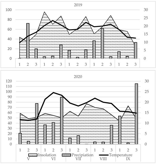 The object of this study was an aromatic medicinal plant, lemon balm (Melissa officinalis L.). The studies were conducted on annual plants. The seeds of lemon balm were obtained from the Breeding and Seed Company W. Legutko (Jutrosin, Poland). The experiments were conducted in 2019–2020 at the Experimental Farm of the University of Life Sciences in Lublin, located in south-eastern Poland (51.23° N; 22.56° E). The lemon balm was grown on loess soil developed from loess formations on chalky marls, containing 1.6% organic matter. The soil reaction was neutral (pHH2O 6.5–7.4), and the following nutrient concentrations were in mg dm−3: 29.8 for N-NO3, 774 for Ca, 164 for K, 74 for P-PO4, and 87 for Mg. The weather conditions prevailing during the study period were presented based on measurements taken in a standard manner at the Research Station of the Department of Agrometeorology of the Lublin University of Life Sciences located at the Experimental Farm Lublin-Felin (51°15′00″ N; 22°34′00″ E; 183 m a.s.l.) (Figure 1). A study on agroclimatic changes in Poland [23] identified 2019 and 2020 as the two warmest years in the 1971–2020 multi-year period. The highest temperature (over 23 °C) was recorded in the 2nd decade of June (2019) and the 2nd and 3rd decades of this month (2020). The highest rainfall (more than 70 mm) occurred in the 2nd decade of May (2019) and the 3rd decade of June (2020). Better solar conditions prevailed in 2019 than in 2020, with the highest sunshine (96 h) found at the beginning of June, followed by over 86 h at the end of June, July, and August in 2019 and at the end of July and beginning of August (over 70 h) in 2020.