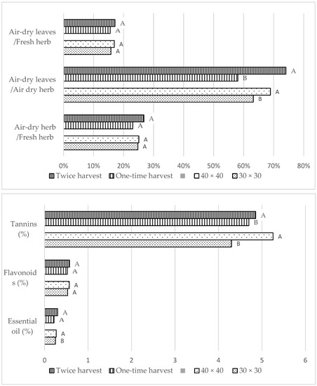 In the first year of this study, lemon balm plants grown at higher densities accumulated significantly more essential oil than the others (Table 3). In contrast, plants grown at lower densities had significantly more tannins than others (in both growing seasons). Harvesting lemon balm twice resulted in a higher oil yield than a single harvest. The contents of essential oil, tannins, and flavonoids depended on the harvest date (Figures S2 and S3).