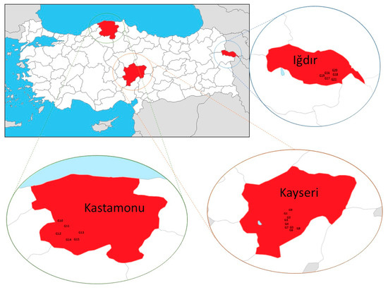 Nine populations of emmer (Triticum dicoccum L.) and twelve populations of einkorn wheat (Triticum monococcum L.) as well as five registered varieties (Dogankent, Kızıltan91, C.1252, Sarıcanak98, and Demir-2000) were used in this study (Table 1). Dogankent is a registered bread wheat, and the others are registered durum wheats. Wheat varieties belonging to different ploidy levels were used to maintain wide variability. The materials were sown in Igdir province during the summer seasons of 2017–2018 and 2018–2019. The experiment field is located in the Agricultural Application and Research field of Igdir University in Türkiye (39°55′42.9″ N latitude, 44°5′37.7″ E longitude at 852 m above sea level) at a distance of 8 km from the province’s administrative center city of Igdir (Figure 1).