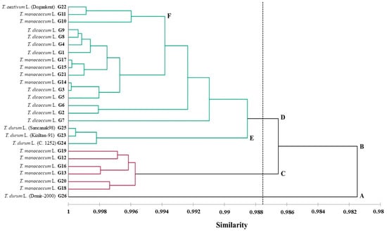 The dendrogram rendered by cluster analysis for wheat genotypes; A and B including main groups, C, D, E, and F comprising subgroups.