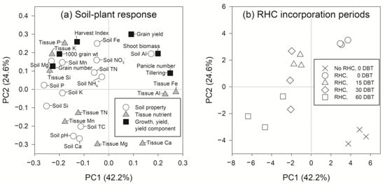Eigenvectors of principal component analysis of (a) soil–plant response parameters to (b) differing lengths of time of rice husk biochar (RHB) incorporation before rice transplanting (DBT). PC1 and PC2 are principal components 1 and 2.