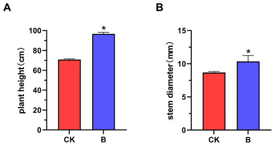 Effect of gibberellin treatment on plant height and stem thickness of forage ramie. CK indicates the control group, and B indicates gibberellin-treated group. (A) Plant height. (B) Stem thickness. The data shown are the mean and SD (error bars). * in the same column indicate significant differences at p ≤ 0.05.
