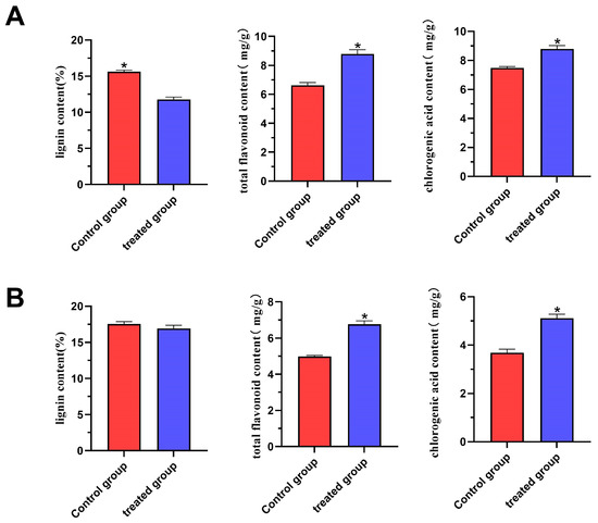 The lignin content in the leaves was significantly decreased after gibberellin treatment (Figure 2A). Specifically, the lignin content in the leaves of the gibberellin-treated group (11.77%) was 32.5% lower than in those of the control group (15.6%). However, the total flavonoid content in the leaves of the gibberellin-treated group was significantly increased by 32.6% to 8.78 mg/g compared to in the leaves of the control group (6.62 mg/g) (Figure 2A). Similarly, the chlorogenic acid content in the leaves treated with gibberellin (8.79 mg/g) was 17.51% higher compared to in the leaves of the control group (7.48 mg/g) (Figure 2A).