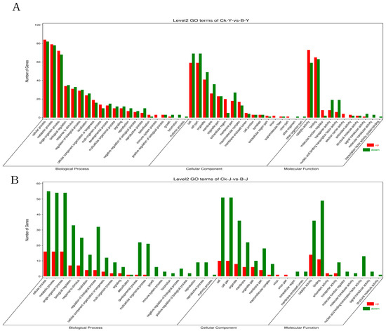 Gene Ontology (GO) enrichment and classification histogram. (A) The GO functional enrichment analyses of the differentially expressed genes (DEGs) in the leaves between the control and gibberellin-treatment groups (CK-YvsB-Y). (B) The GO functional enrichment analyses of the DEGs in the stem between the control and gibberellin-treatment groups (CK-JvsB-J). The ordinate is the number of the DEGs annotated with the term, while the abscissa is the secondary GO term. Up- and down-regulated genes in the gibberellin-treated group are indicated in red and green, respectively.