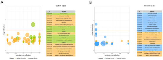 The Gene Ontology (GO) functional enrichment analysis bubble diagram of the differentially expressed genes (DEGs) in the leaves (CK-YvsB-Y) and stem (CK-JvsB-J). (A) The top 20 GO terms in the leaves (CK-YvsB-Y). (B) The top 20 GO terms in the stem (CK-JvsB-J). The ordinate is the −log10(p-value) in the GO functional enrichment bubble chart, and the larger the ordinate, the smaller the p-value. The abscissa is the ratio of the difference between the number of up-regulated and down-regulated genes to the total DEGs. The orange line indicates the significance threshold level at p = 0.05, and the bubbles above the threshold line are significant.
