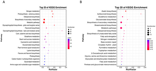 Kyoto Encyclopedia of Genes and Genomes (KEGG) pathway enrichment bubble map. (A) The KEGG pathway enrichment map of the differentially expressed genes (DEGs) in the leaves between the control and the gibberellin-treated groups. (B) The KEGG pathway enrichment map of the DEGs in the stem between the control and the gibberellin-treated groups. The pathway names are shown along the ordinate, and the abscissa indicates the enrichment factor. The larger the abscissa, the more reliable the enrichment and significance of the gene products in the pathway. Bubble size represents the number of genes; larger bubbles represent more genes.