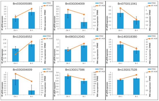 Comparing the expression levels of the nine DEGs obtained using qRT-PCR and the fragments per kilobase of transcript per million mapped reads (FPKMs) values of the transcriptome sequencing data revealed that the expression estimates of each gene in transcriptome sequencing were consistent between the two methods, suggesting that the transcriptome data are reliable (Figure 6).