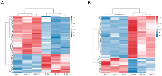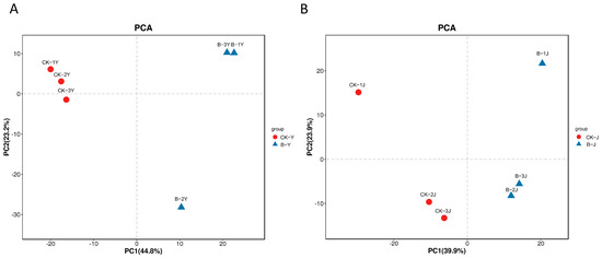 Principle component analysis (PCA) score scatterplot. (A) PCA of the control and gibberellin-treated leaves. (B) PCA of the control and gibberellin-treated stems. Red represents the control sample (CK-Y, CK-J), and blue indicates the gibberellin-treated group (B-Y, B-J). The shorter the distance between samples within the same group, the better the repeatability.