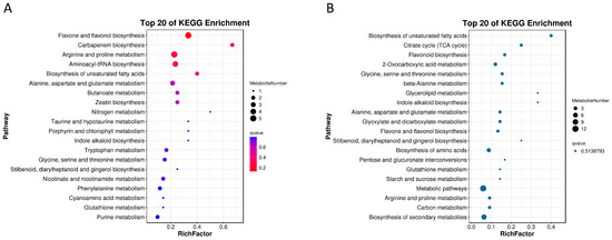 Kyoto Encyclopedia of Genes and Genomes pathway enrichment bubble diagram of the differential metabolites between the gibberellin-treated ramie and the control. (A) KEGG pathway enrichment analysis of the differential metabolites in leaves. (B) KEGG pathway enrichment analysis of the differential metabolites in the stem.