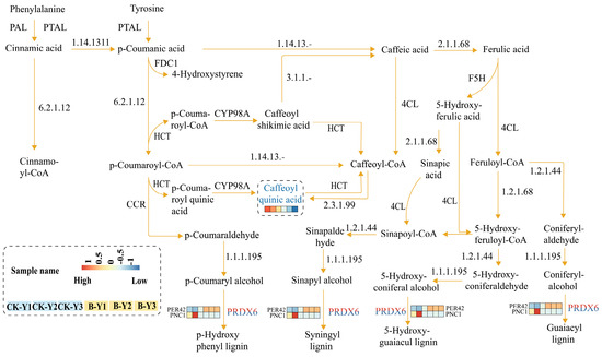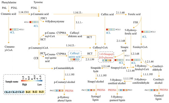 The biosynthetic pathway of phenylpropane in ramie leaves. The differential genes are indicated as a heat map next to the relevant enzymes; the dashed boxes indicate the differential metabolites.