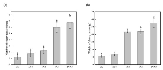 Effect of inoculation of B. cereus DW019 on the yield of cherry tomato: (a) number of cherry tomato; (b) Weight of cherry tomato. Control without inoculation, CK; inoculation with dead cells at 108 CFU mL−1, DVC8; inoculation with viable cells at 108 CFU mL−1, VC8; inoculation with viable cells at 109 CFU mL−1, VC9; inoculation with viable cells at 2 × 109 CFU mL−1, DVC9. Different lowercase letters above columns indicate significant differences at p < 0.05.