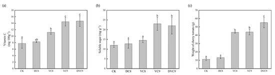 Nutritional quality of cherry tomato fruits: (a) vitamin C; (b) soluble sugar; (c) protein. Control without inoculation, CK; inoculation with dead cells at 108 CFU mL−1, DVC8; inoculation with viable cells at 108 CFU mL−1, VC8; inoculation with viable cells at 109 CFU mL−1, VC9; inoculation with viable cells at 2 × 109 CFU mL−1, DVC9. Different lowercase letters above columns indicate significant differences at p < 0.05.