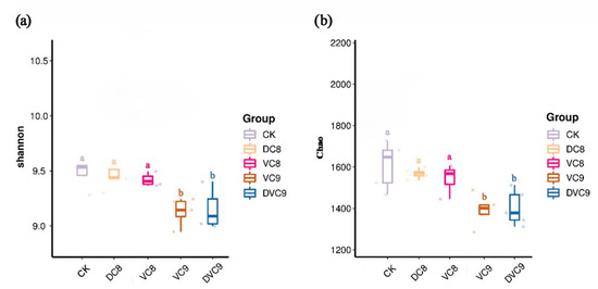 The Shannon and Chao indices of rhizosphere soil bacteria of cherry tomato. (a) The bacterial Shannon index of rhizosphere soil bacteria. (b) The bacterial Chao index of rhizosphere soil bacteria. Control without inoculation, CK; inoculation with dead cells at 108 CFU mL−1, DVC8; inoculation with viable cells at 108 CFU mL−1, VC8; inoculation with viable cells at 109 CFU mL−1, VC9; inoculation with viable cells at 2 × 109 CFU mL−1, DVC9. Different lowercase letters above columns indicate significant differences at p < 0.05.