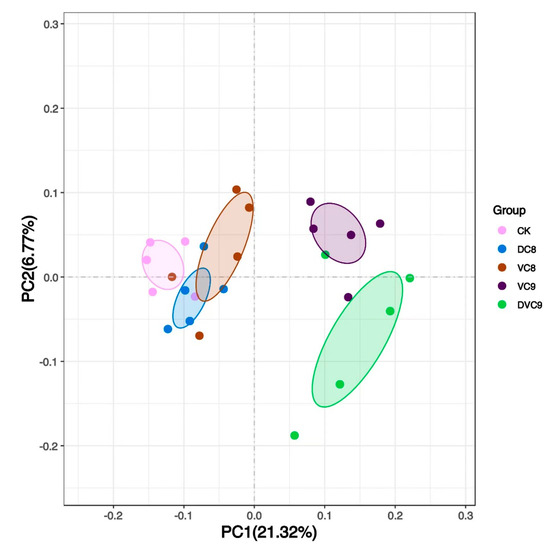 The PCoA showed that all the soil samples were integrated into five groups despite some overlaps between DC8 and VC8 (Figure 2). The first principal axis revealed that the closest distance lay between CK and DC8 samples, while the VC8 and DC8 groups were close, and so were the DVC9 and VC9 samples (Figure 5). The first principal–coordinate axis (PCoA1) contributed 21.32% of the total variation, indicating that the largest separation factor was the inoculation concentration, which clearly separated the rhizosphere soil bacterial community of cherry tomato (p < 0.001). Therefore, inoculation with DW019 in cherry tomato had a significant effect on the rhizosphere bacterial β diversity.