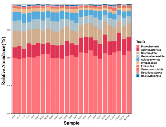 Changes in the relative abundance of major phylum levels of soil bacteria: control without inoculation, CK; inoculation with dead cells at 108 CFU mL−1, DVC8; inoculation with viable cells at 108 CFU mL−1, VC8; inoculation with viable cells at 109 CFU mL−1, VC9; inoculation with viable cells at 2 × 109 CFU mL−1, DVC9.
