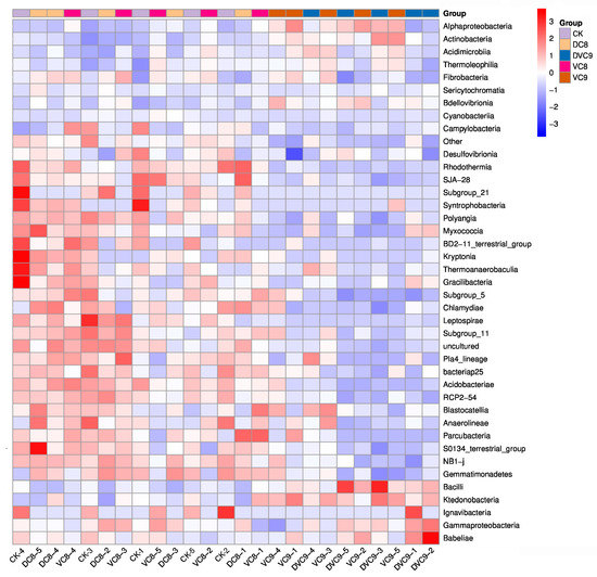 Changes in the relative abundance of major class levels of soil bacteria: control without inoculation, CK; inoculation with dead cells at 108 CFU mL−1, DVC8; inoculation with viable cells at 108 CFU mL−1, VC8; inoculation with viable cells at 109 CFU mL−1, VC9; inoculation with viable cells at 2 × 109 CFU mL−1, DVC9.