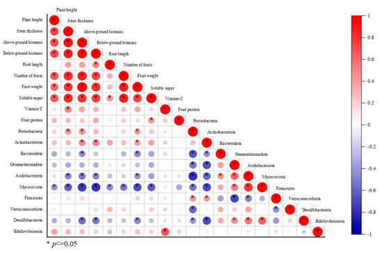 At the phylum level, there was a significant negative correlation between plant height and Myxococcota. Stem thickness was positively correlated with Proteobacteria and negatively correlated with Acidobacteriota and Myxococcota. There was a significant positive correlation between above-ground biomass and Proteobacteria and Actinobacteriota and a significant negative correlation with Bacteroidota, Acidobacteriota, Myxococcota and Desulfobacterota. Below-ground biomass was positively correlated with Actinobacteriota and negatively correlated with Acidobacteriota, Myxococcota and Desulfobacterota. There was a significant negative correlation between root length and Myxococcota. There was a significant negative correlation between cherry tomato number and Myxococcota. The cherry tomato weight was the same as the above-ground biomass and was positively correlated with Proteobacteria and Actinobacteriota. The difference between number and weight was negatively correlated with Bacteroidota, Acidobacteriota and Myxococcota. Soluble sugar appeared to have a significant negative correlation with Myxococcota. A significant positive correlation was revealed between vitamin C and Bdellovibrionota. However, no significant correlation was found between fruit proteins and the relative abundance of microorganisms.