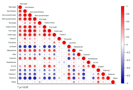 At the genus level (Figure 9), plant height was significantly negatively correlated with uncultured bacteria, Ellin6067, Subgroup_7 and Bryobacter and significantly positively correlated with Sphingomonas and Lysobacter. Stem thickness, above-ground biomass, below-ground biomass and fruit number were significantly and positively correlated with Sphingomonas, Lysobacter and SC-I-84 but negatively correlated with uncultured bacteria, Ellin6067, Subgroup_7 and Bryobacter. Root length was significantly positively correlated with Sphingomonas and negatively correlated with the other genera. Fruit yield was significantly negatively correlated with uncultured bacteria and Bryobacter and positively correlated with Sphingomonas, Lysobacter and SC-I-84. Soluble sugars were significantly positively correlated with Sphingomonas and SC-I-84 and negatively correlated with Ellin6067, Subgroup_7 and Bryobacter. Vitamin C content was significantly positively correlated with stem thickness only, rather than with bacterial abundance. There was no significant correlation between fruit protein content and the relative abundance of microorganisms. The correlation results suggested that the application of PGPR can promote crop growth and improve the yield of cherry tomato by changing microbial community composition and the function of root dominant bacteria, especially of rhizosphere bacteria.