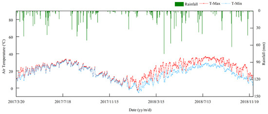 Daily air temperature and precipitation in the cropping system during the 2017–2018 experimental period.