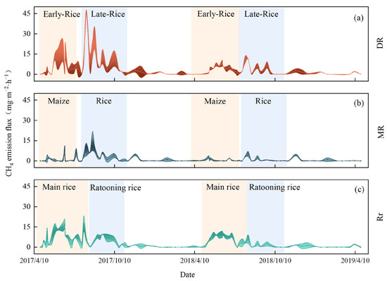 Average daily CH4 flux (n = 3) of three different cropping systems from 2017 to 2018: (a) DR: double-cropping rice; (b) MR: maize rice; (c) Rr: ratooning rice. The shaded part represents the standard deviations of the means.